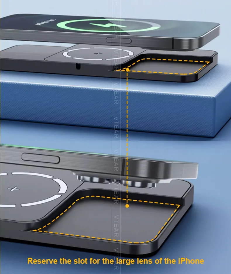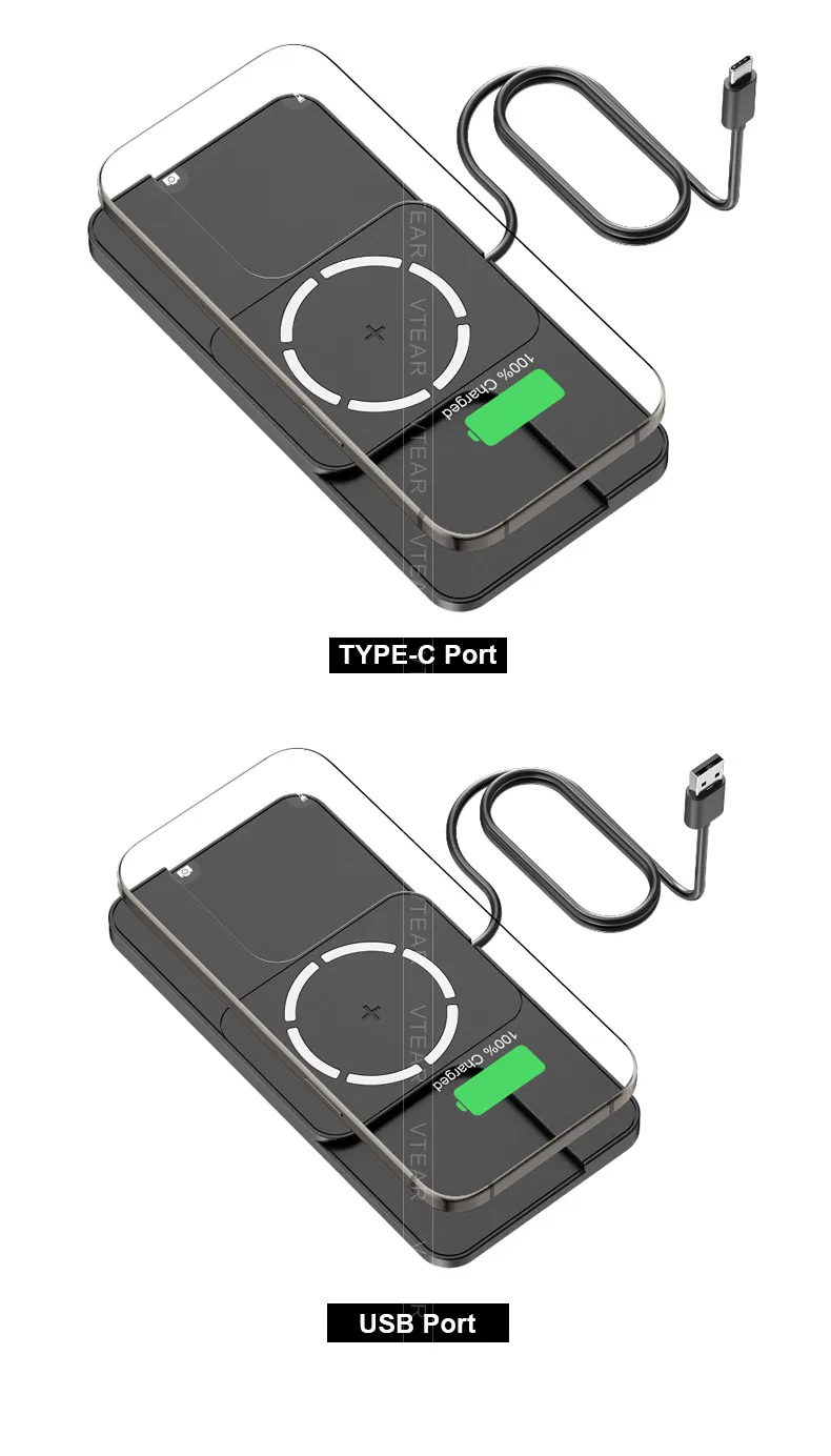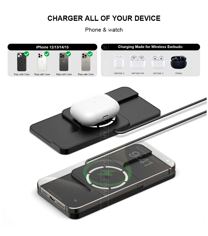 Features a magnetic charging area for phones and a flat wireless pad for earbuds or smaller devices, making it convenient for multi-device charging during travel.
